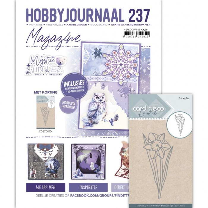 Hobbyjournaal Magazine, nieuwe stijl. Met veel voorbeeldkaarten, borduur- en hobbydotspatronen. Centraal staan de collecties Mystic Winter van Berrie's Beauties en We Are Men van Amy Design. -