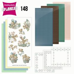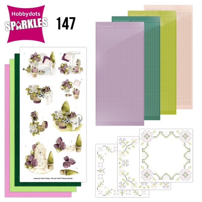 Deze set met Hobbydots-Sparkles bevat alle materialen voor 3 vierkante kaarten. De inhoud bestaat uit vier Sparkles stickervellen, drie 3D-afbeeldingen, drie witte oplegkaarten met bijpassende patronen en drie vellen kaartkarton. Het patroon is in kleur voorgedrukt op de oplegkaarten, waardoor je de stickers, zonder een Led Board te gebruiken, direct hierop kunt plakken. -