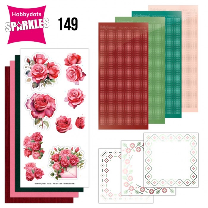 Deze set met Hobbydots-Sparkles bevat alle materialen voor 3 vierkante kaarten. De inhoud bestaat uit vier Sparkles stickervellen, drie 3D-afbeeldingen, drie witte oplegkaarten met bijpassende patronen en drie vellen kaartkarton. Het patroon is in kleur voorgedrukt op de oplegkaarten, waardoor je de stickers, zonder een Led Board te gebruiken, direct hierop kunt plakken.